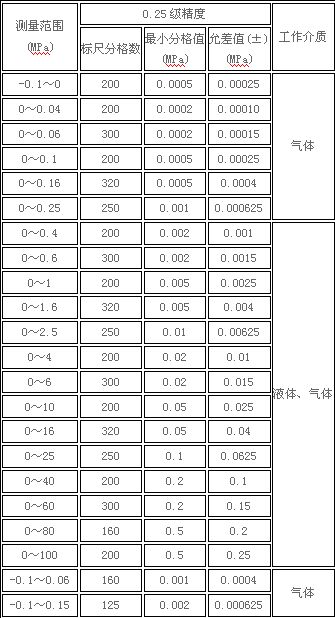 0.25級(jí)精密壓力表是一種按精度等級(jí)分類的稱謂, 0.25級(jí)是指該精密壓力表的精度等級(jí), 標(biāo)識(shí)其允許的最大示值基本誤差為其測量上限值的±0.25%. 通常將這種精密壓力表稱為0.25級(jí)精密壓力表。
